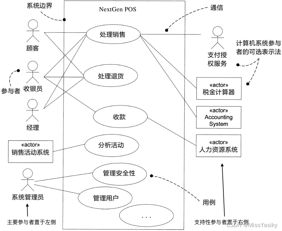 - 重点是==对外部的什么个体,提供了业务流程中的什么价值==,系统能够为执行者提供的、涉众可以接受的价值
